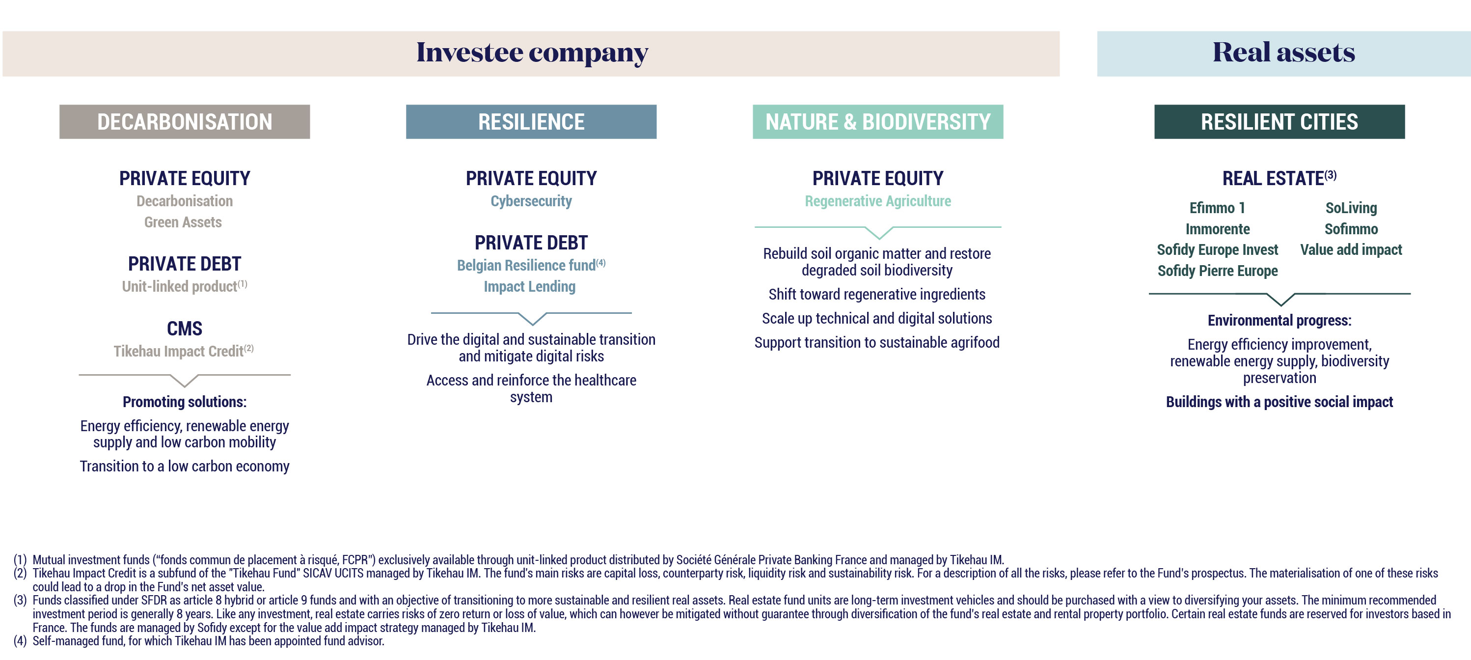 Tikehau Capital distinguishes between “impact investing” and “sustainable investment” according to the SFDR’s definitions. The Group’s impact approach is based on international reference frameworks (Global Impact Investing Network – GIIN, IRIS+, SDGs, Impact Management Project, UN PRI, etc.).